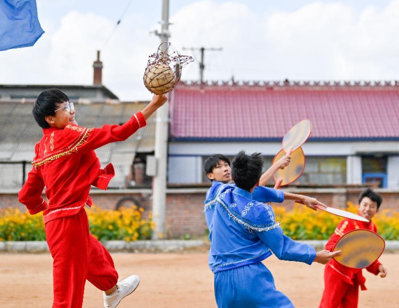 吉林省吉林市乌拉街满族中学学生在比赛中接住珍珠球得分。 新华社记者 颜麟蕴 摄