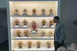 该奖柜正中央成列的是历史上唯一的超级金球奖,1989年由皇马传奇迪斯蒂法诺获得。