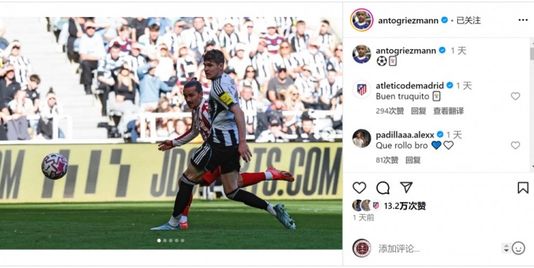 马竞在友谊赛中2-0击败纽卡,此役取得进球的格列兹曼更新社媒动态,晒出比赛照片,以及自己在球场上手拿梅西球星卡的照片。