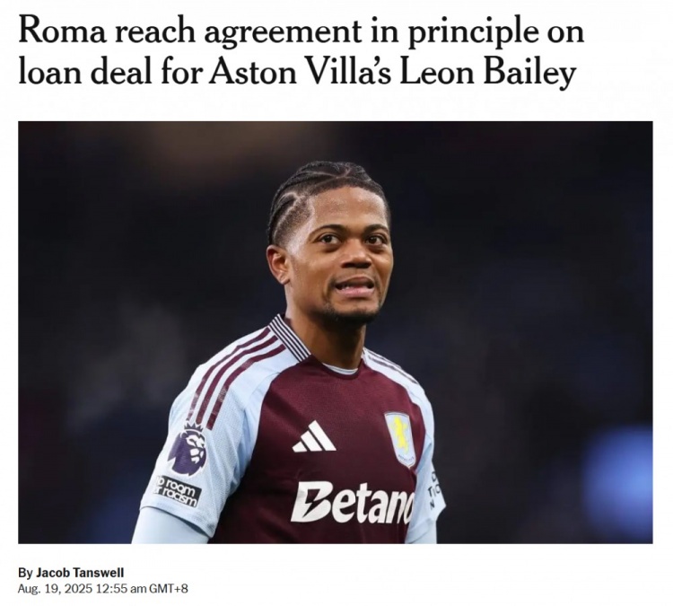 这名28岁的球员当前合同至2027年,他是多名可能离开维拉的球员之一。利昂-贝利将成为罗马夏窗的第七笔引援,继埃文-弗格森之后第二笔来自英超的引援。